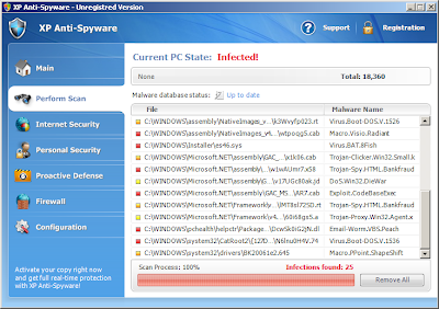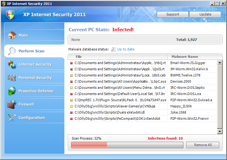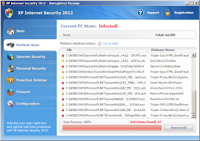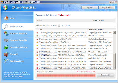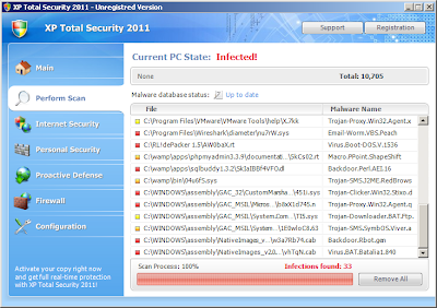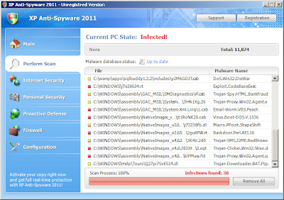 A new version of the multi-rogue scareware has been released. This malware is looking for the OS version (XP, Vista, Seven) and changes its name and skin: XP Anti-Spyware, XP Home Security 2011, XP Anti-Virus 2011 (...). It belongs to the Braviax family. As usual it displays fake warning messages to push users into buying a license.