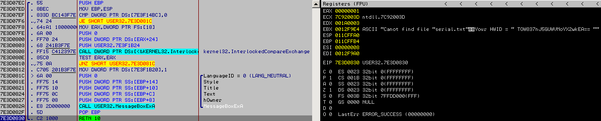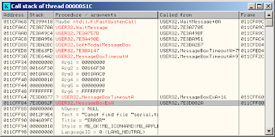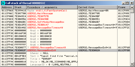 Double click on the 'Called from' line who use the API MessageBoxExA